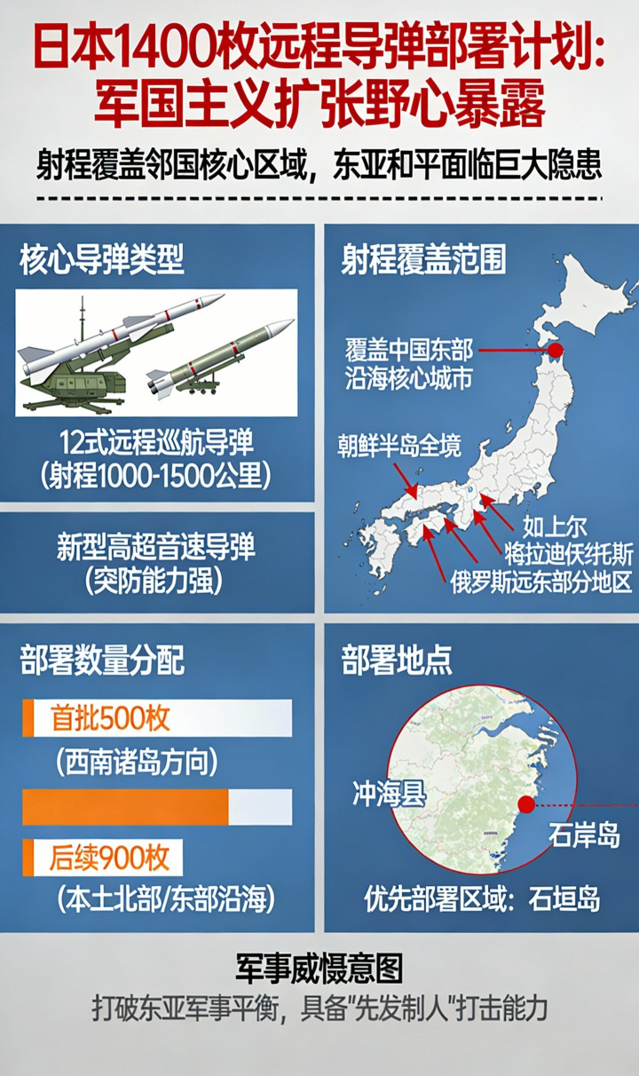 这还只是开始,日本早就规划好了“导弹封锁链”,要在2026年前,在冲绳、宫古岛、石垣岛等西南诸岛,一口气建12处导弹阵地。这些岛屿离我国东南沿海最远也就千公里,后续部署的增程导弹射程能破1000公里,咱们的沿海城市、军事基地,甚至韩国南部的港口,都成了精准打击目标,相当于在周边国家的家门口布了一圈火力网。